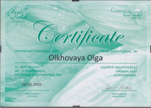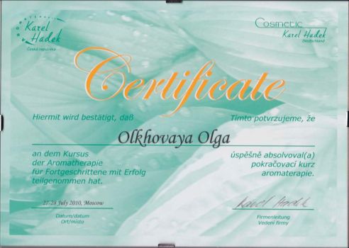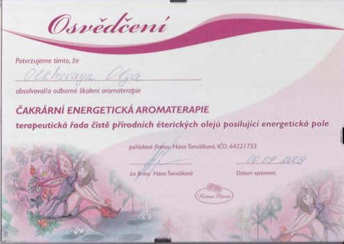 Прошла сертифицированное обучение в Чехии "Aromaterapia Karel Hadek", "Cakrarni energeticka aromaterapie" Hanna Maria