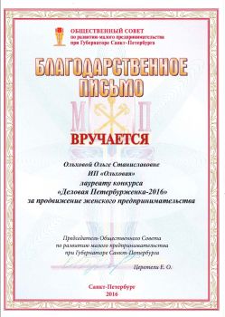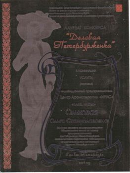 Лауреат конкурса "Деловая петербурженка" в номинации «Услуги "Центр Ароматерапии ИРИС" и "Карел Хадек"» при поддержке губернатора Санкт-Петербурга